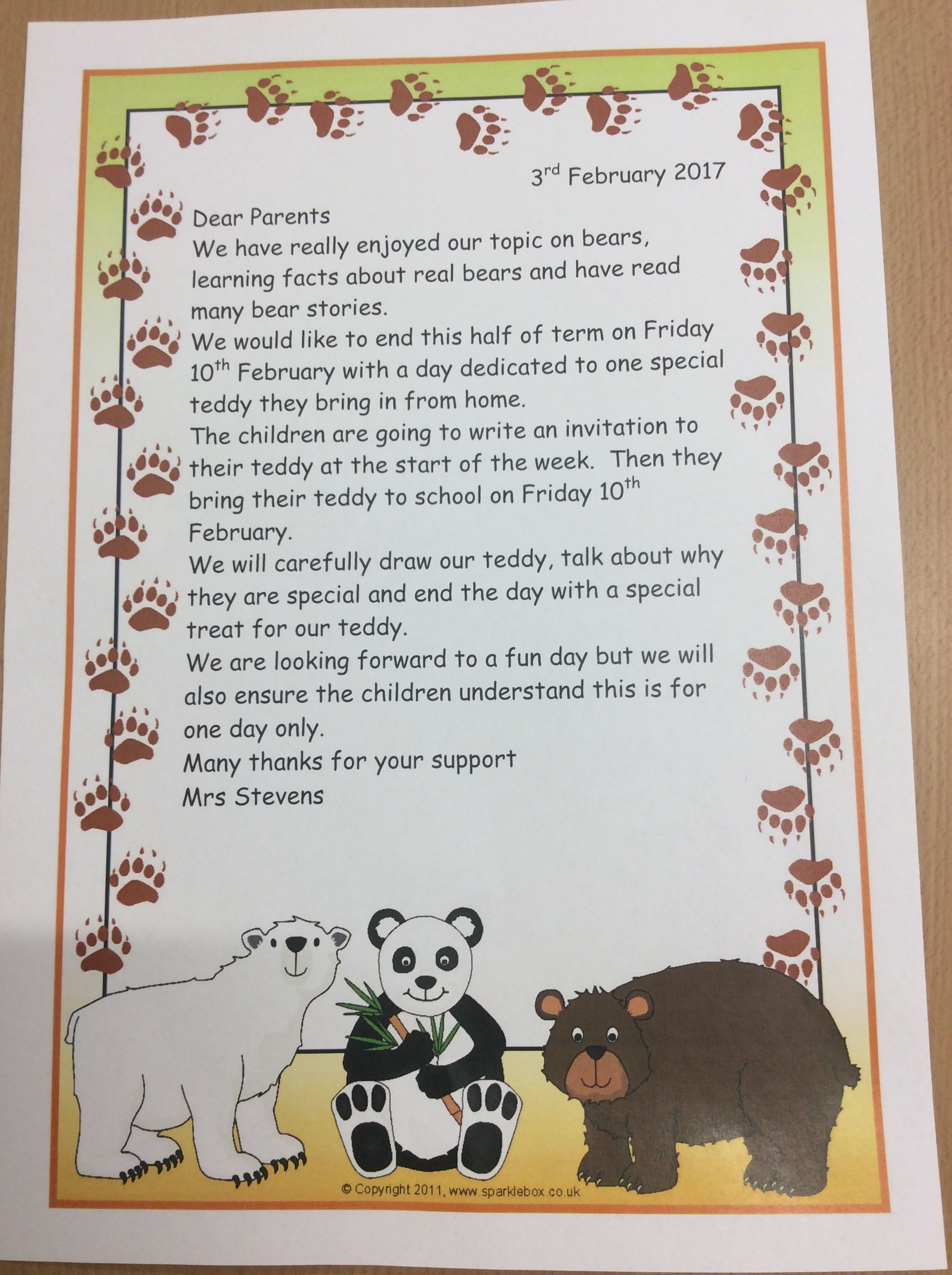 And, lastly, following on from our work on bears last week, this is a copy of the letter coming home in book-bags tonight - don't forget to bring a teddy to school next Friday!